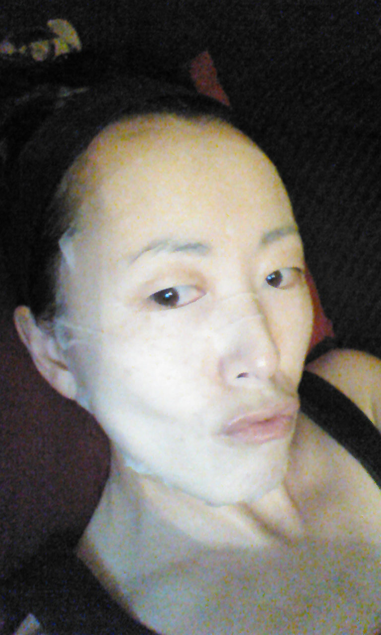 This is one of the wettest mask sheets I’ve tried. It’s on par with My Beauty Diary in terms of saturation, so I settled in on the sofa, looking forward to a luxurious 45 minutes or so of cool, refreshing hydration and relaxation. The essence has a very light fragrance, halfway between peachy and flowery. It’s subtle and pleasant and didn’t bother me at all, even though I already had a headache. Very promising so far.