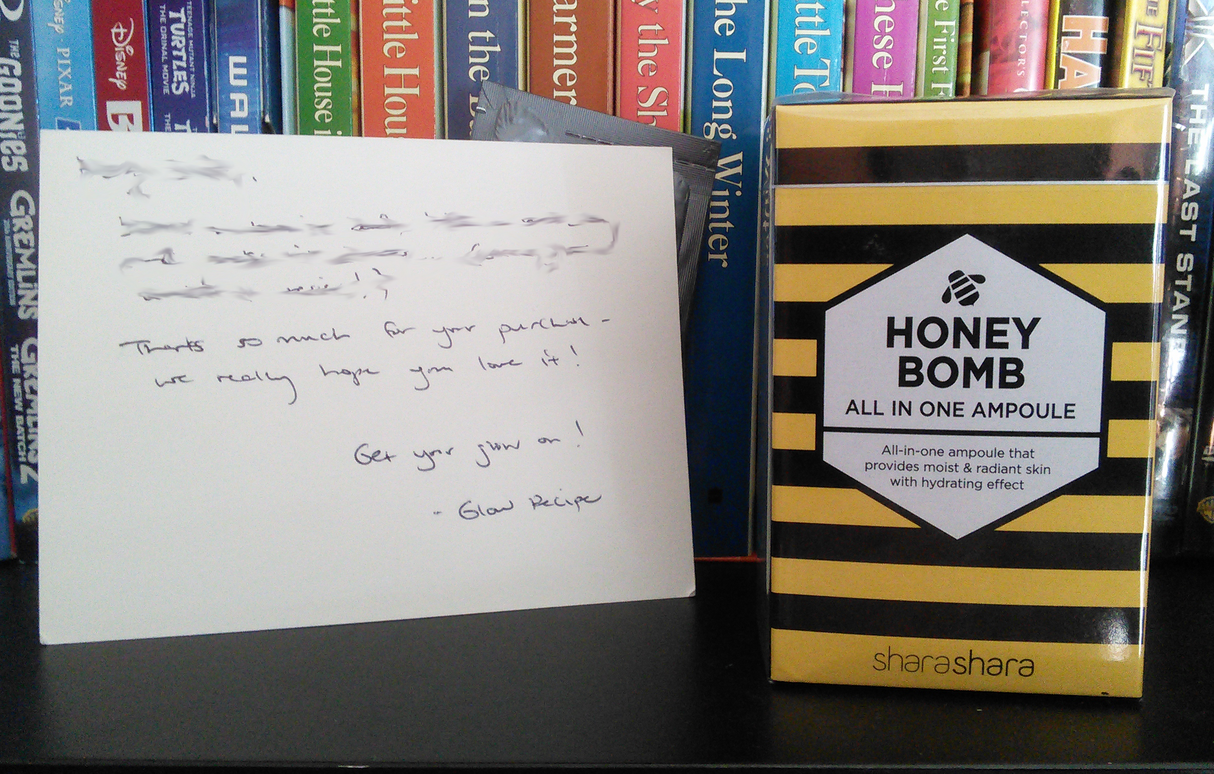 Shara Shara Honey Bomb ampoule and Glow Recipe personal thank-you card