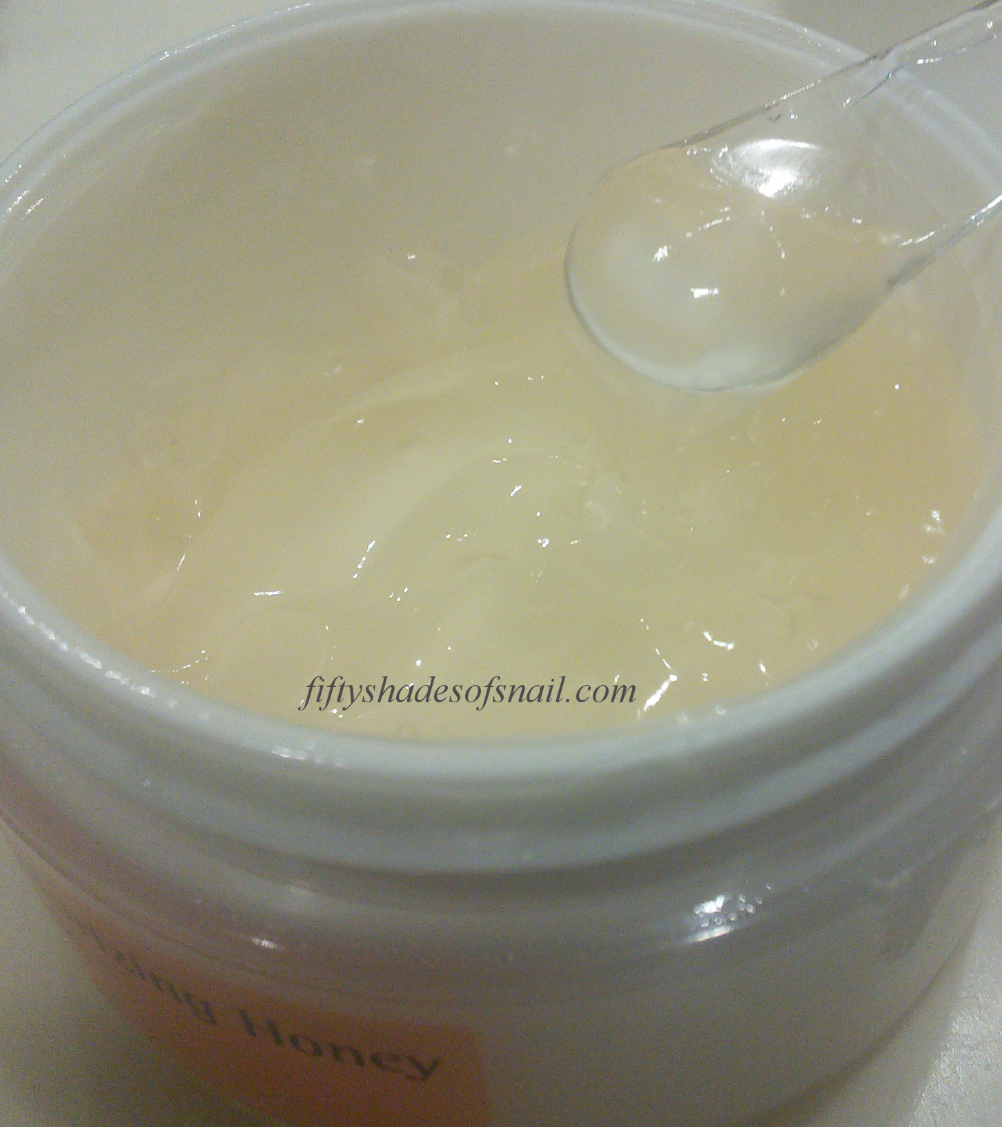 The Ultimate Moisturizing Honey Overnight Mask is a light and very easily spreadable golden gel with an almost undetectable hint of that sweet smell that I’ve come to associate with propolis extract, since my Tosowoong Propolis Sparkle Ampoule and Graymelin Propolis 80 Energy Ampoule smell like that, too.