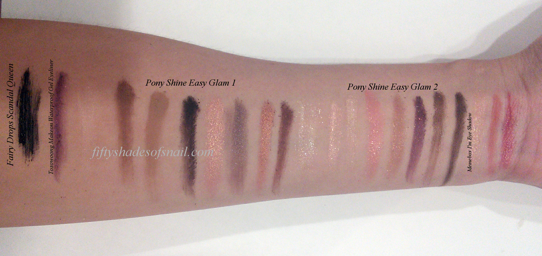 I did something a little different for this review than I normally do. Instead of attempting another handface (I’m kind of shamed after seeing my friend Cat’s magnificent hand art in her Clio Pro Palette first look), I thought I’d kill two birds with one stone and show you guys the Memebox eyeshadows that I was also recently gifted by our squad leader! Below, you’ll find cotton swab swatches of every shade in the upgraded Pony x Memebox Pony Shine Easy Glam palettes, and three I’m Eye Shadow singles, too. Swatches are shown on a base of Skinfood Royal Honey Cover Bounce Cushion applied over a generous layer of Biore Perfect Milk sunscreen, which is all the primer I need, baby.