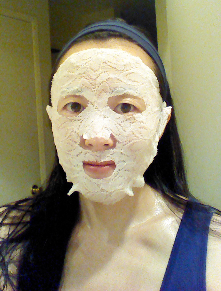 Well, I’m wearing a MBD Black Pearl mask with extra essence applied before and on top, and then a Daiso cover over that (after leaving it for about 5 minutes). Applying the mask was one of the slimier experiences of my life.