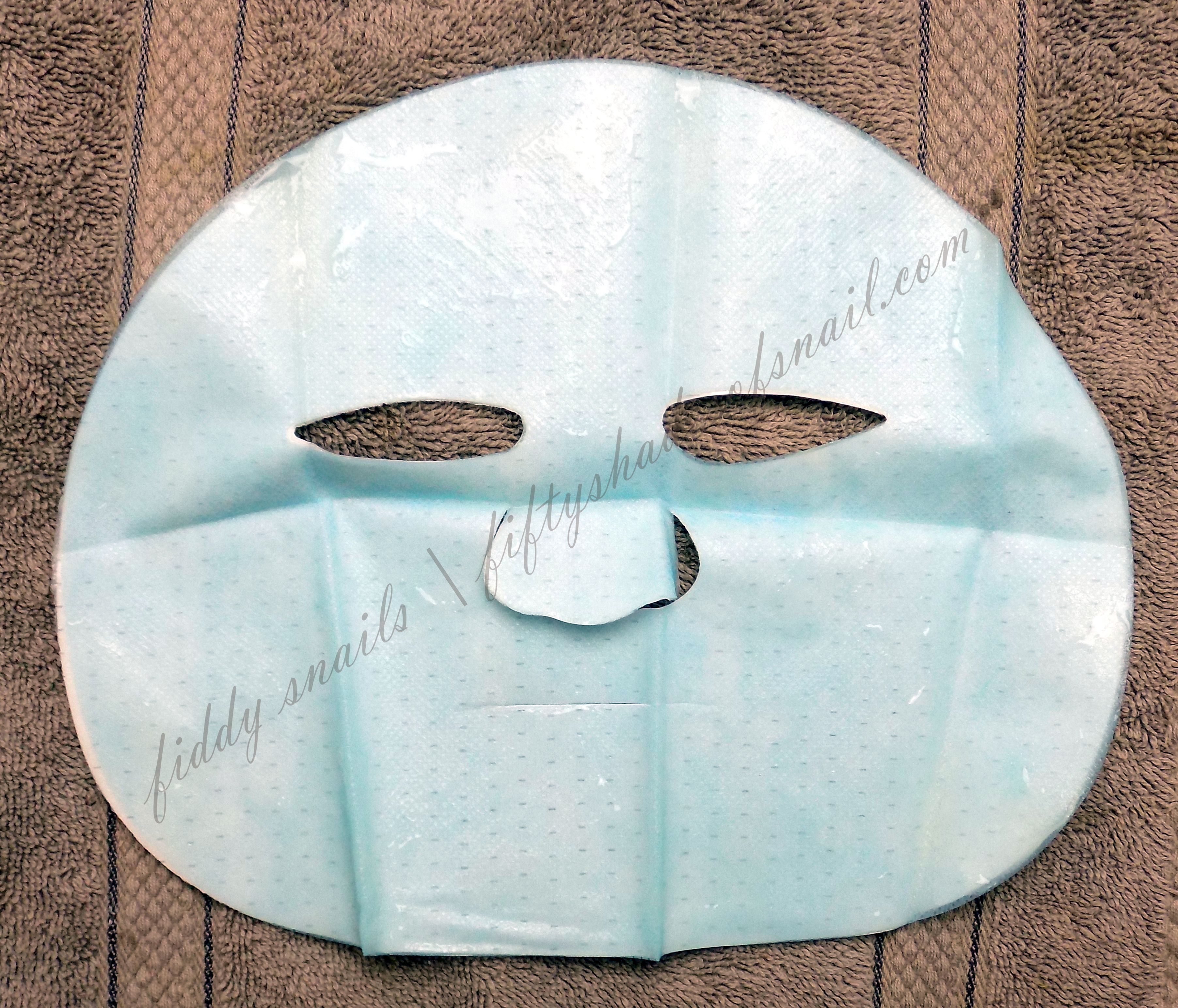 This mask has two protective backings: white plastic “pearl paper” on one side and a thinner blue paper backing on the other. The blue side is not part of the actual mask. It is only there to give structure to the mask during application. You’re supposed to take it off when you put the mask on. Don’t do what I did.