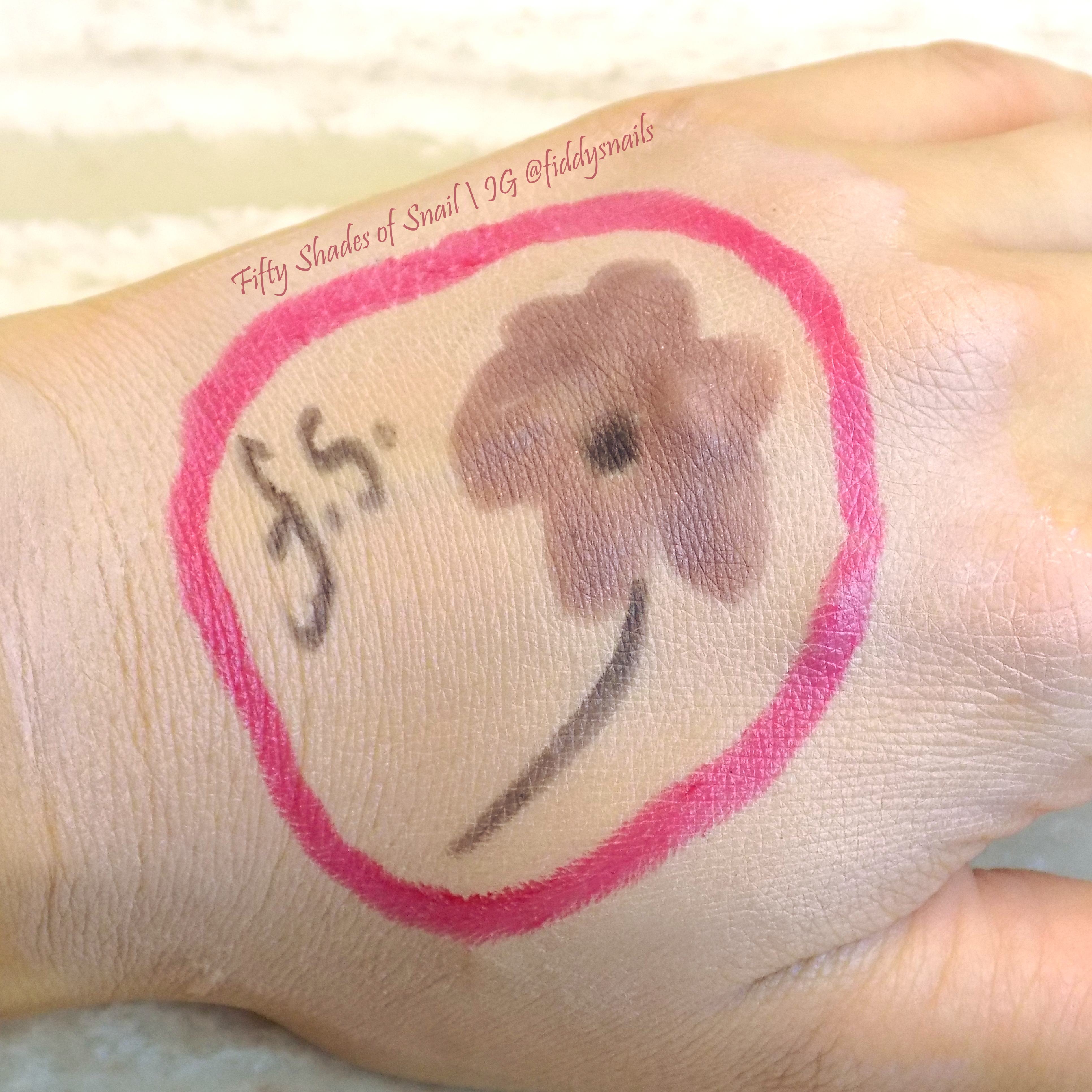 I applied a generous layer of Biore UV Perfect Bright Milk* to the back of my hand, let it dry fully, then added two heavy layers of Holika Holika x Gudetama Face 2 Change BB cushion*. After that dried, which took quite a while because I laid it on thick, I used Memebox I’m Meme* eyeliner, stick eyeshadow, and lip crayon to clumsily draw and sign my fresh hand art. Then more drying time.