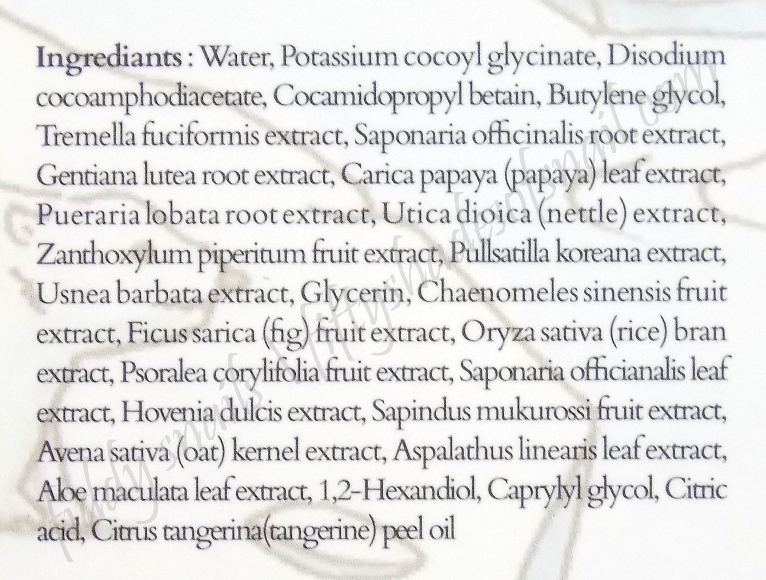 Treeannsea LiquidE Mousse Foam ingredients:  Water, potassium cocoyl glycinate, disodium cocoamphodiaceate, cocamidopropyl betaine, butylene glycol, tremella fuciformis extract, saponaria officinalis root extract, gentiana lutea root extract, carica papaya (papaya) leaf extract, pueraria lobata root extract, utica dioica (nettle) extract, zanthoxylum piperitum fruit extract, pullsatilla koreana extract, usnea barbata extract, glycerin, chaenomeles sinensis fruit extract, ficus carica (fig) fruit extract, oryza sativa (rice) bran extract, psoralea corylifolia fruit extract, saponaria officianalis leaf extract, hovenia dulcis extract, sapindus mukurossi fruit extract, avena sativa (oat) kernel extract, aspalathus linearis leaf extract, aloe maculata leaf extract, 1,2-hexanediol, caprylyl glycol, citric acid, citrus tangerina (tangerine) peel oil