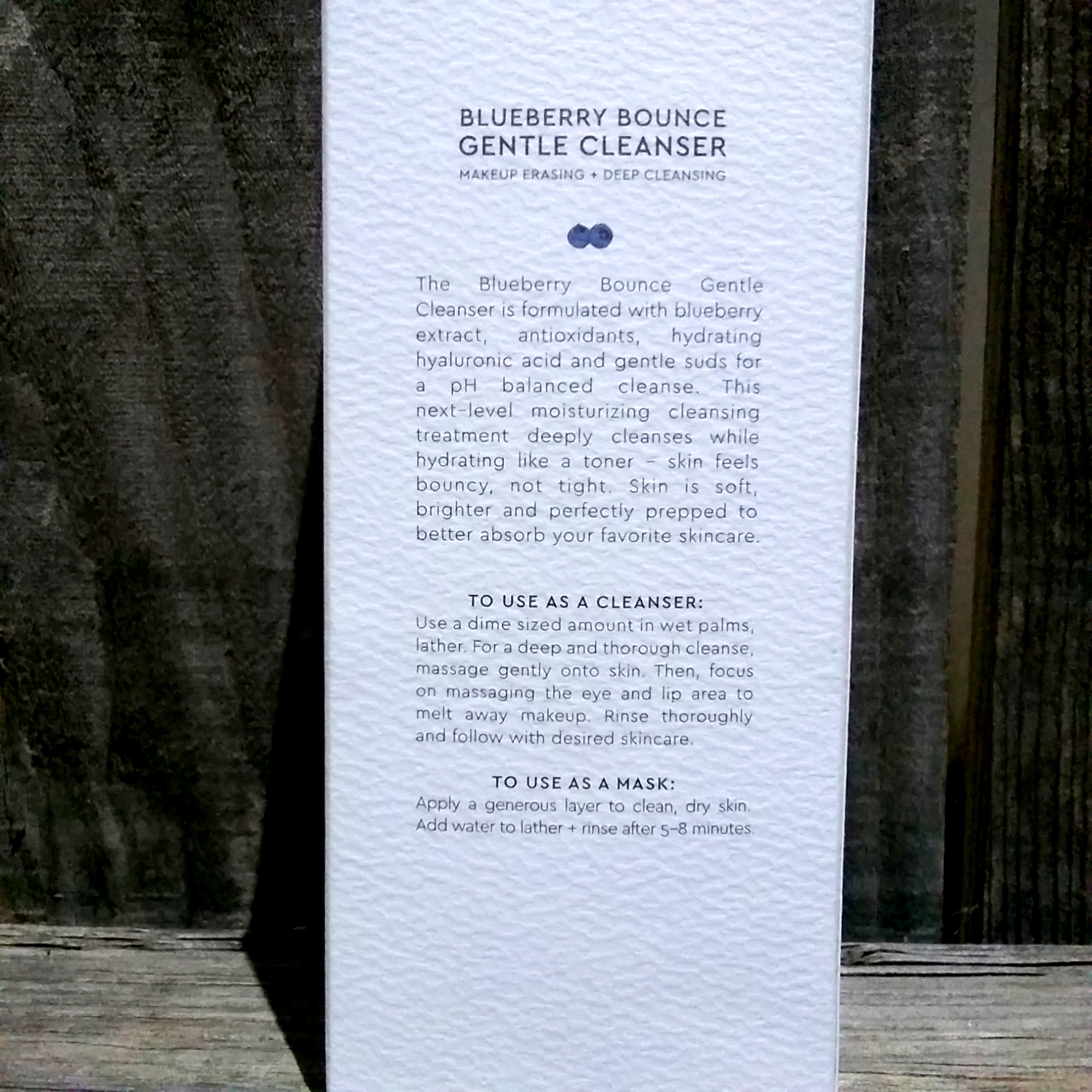 With the Blueberry Bounce Gentle Cleanser, I feel like the packaging is an eerily accurate representation of the product. It looks nice–I like the look of the tube and the textured material and clean design of the box, and the blueberry-printed interior is a cute touch–but the cardboard feels flimsy and so does the tube, which started getting dented and deflated after less than a week of use.