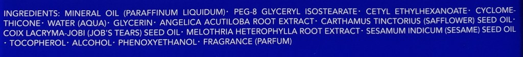 SEKKISEI Treatment Cleansing Oil ingredients: Mineral oil, PEG-8 glyceryl isostearate, cetyl ethylhexanoate, cyclomethicone, water, glycerin, angelica acutiloba root extract, carthamus tinctorus (safflower) seed oil, coix lacryma-jobi (job’s tears) seed oil, melothria heterophylla root extract, sesamum indicum (sesame) seed oil, tocopherol, alcohol, phenoxyethanol, fragrance